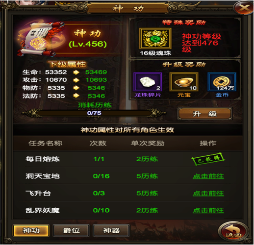神功功能需要历练经验才能升级,每次升级都会获得:金币,道具,元宝,属性等奖励,神功达到特定等级还可获得魂珠奖励。魂珠不仅仅只增加基础属性还可获得特殊的高级暴击属性,如果玩家幸运触发,战斗力大涨,说不定就此过了原来通不过的关卡。